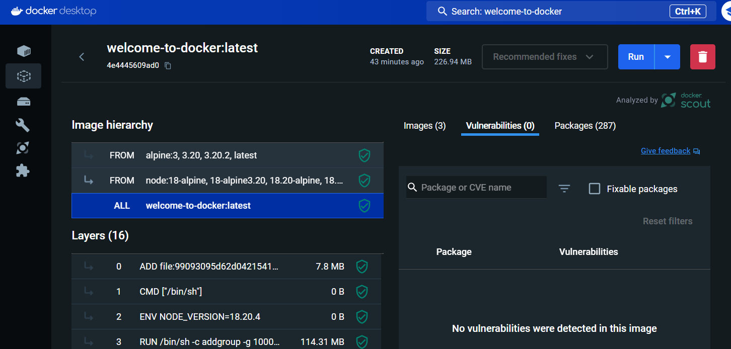 해당 이미지 명을 클릭하면 아래 그림과 같이 생성된 이미지의 세부 내용을 확인할 수 있고 Run버튼을 클릭하여