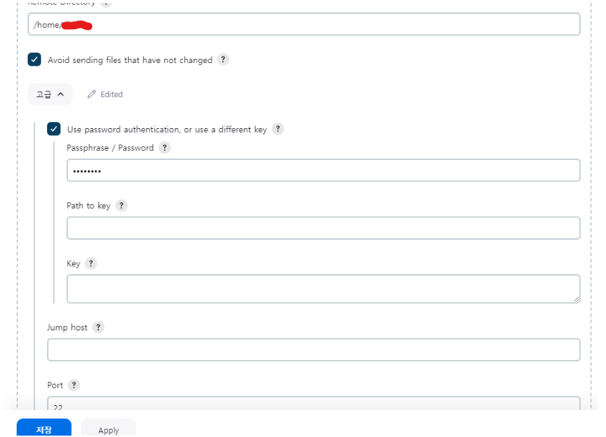 - Remove directory : 원격지 서버 계정의 home 경로 기준으로 파일을 올릴 폴더 위치를 지정한다.