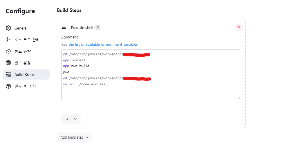 jenkins서버에서 npm 명령어를 사용해 빌드를 하는 커멘드를 설정한다.