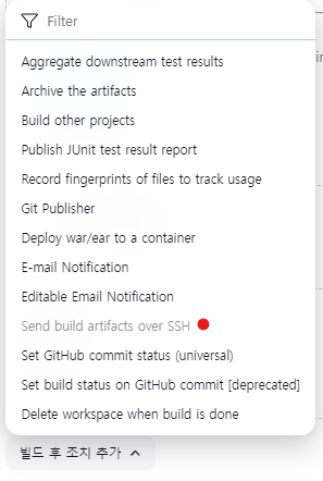 "빌드 후 조치추가" 버튼을 클릭해서 아래 그림과 같이 over SSH를 선택한다.
