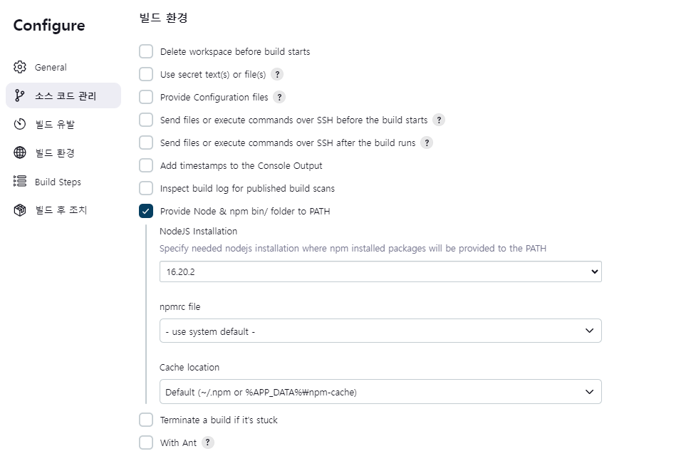 아래 그림과 같이 Provide Node & npm bin/ folder to PATH 항목을 체크하고 빌드에 사용할 node.js버전을 선택해 준다.