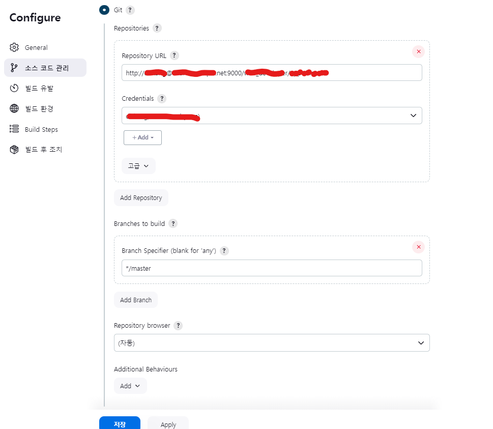 별겨 없다 Git Repository 주소 입력 후 Credentials 부분에 "+Add"를 클릭하여 Git 계정 정보 ID/Password를 넣어주고
