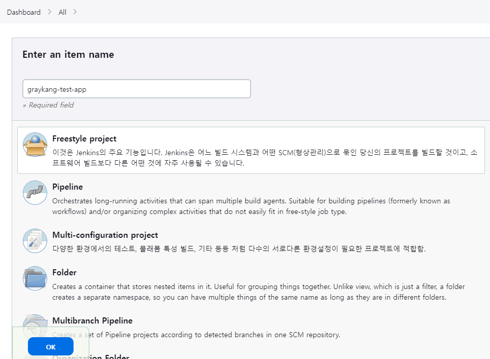 아래 그림과 같이 새로운 ITEM을 Freestyle project로 생성해 준다.