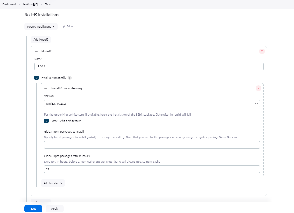 version 항목에서 빌드에 사용될 node.js 버전을 선택하고 Name도 node.js버전으로 적어주자 나머진 건들지 말고 저장하면 된다.