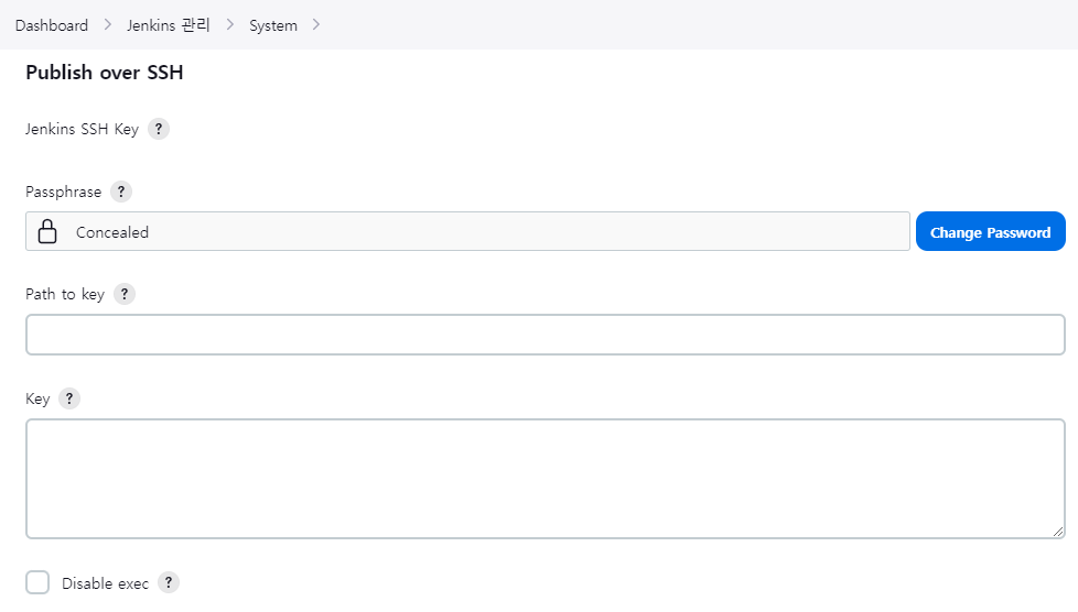 Publish over SSH plugin 설정을 하기 위해서는 jenkins관리에 System 메뉴를 선택해 설정한다.